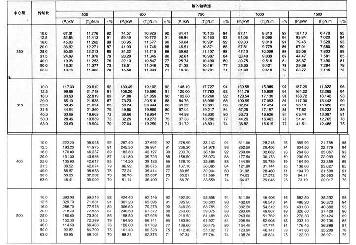 平面包絡環面蝸桿減速器額定輸入軸功率表