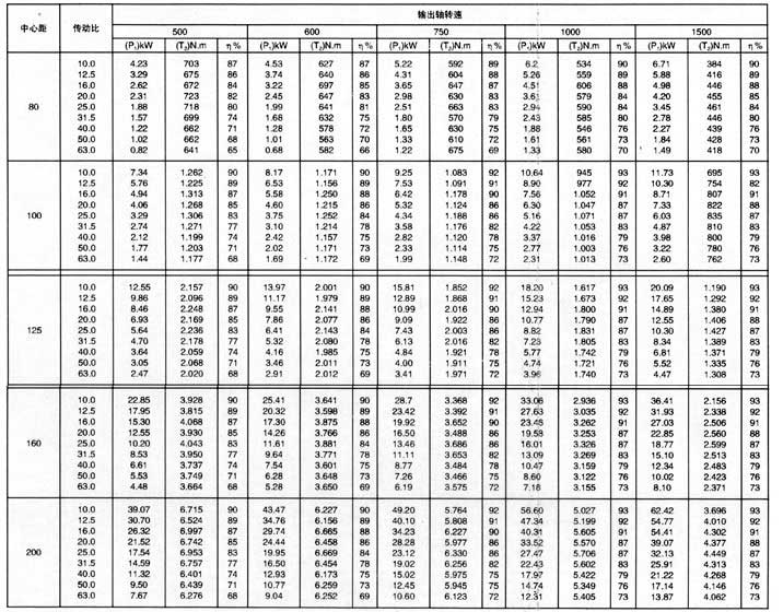 2.表中額定輸入功率P1及額定輸出扭矩T2,適用于TPU、TPS型減速器,工作載荷平穩無沖擊,每日工作8h,每小時啟動10次,啟動扭矩為輸出扭矩的2.5倍,小時負荷率jc=100%,環境溫度為20。